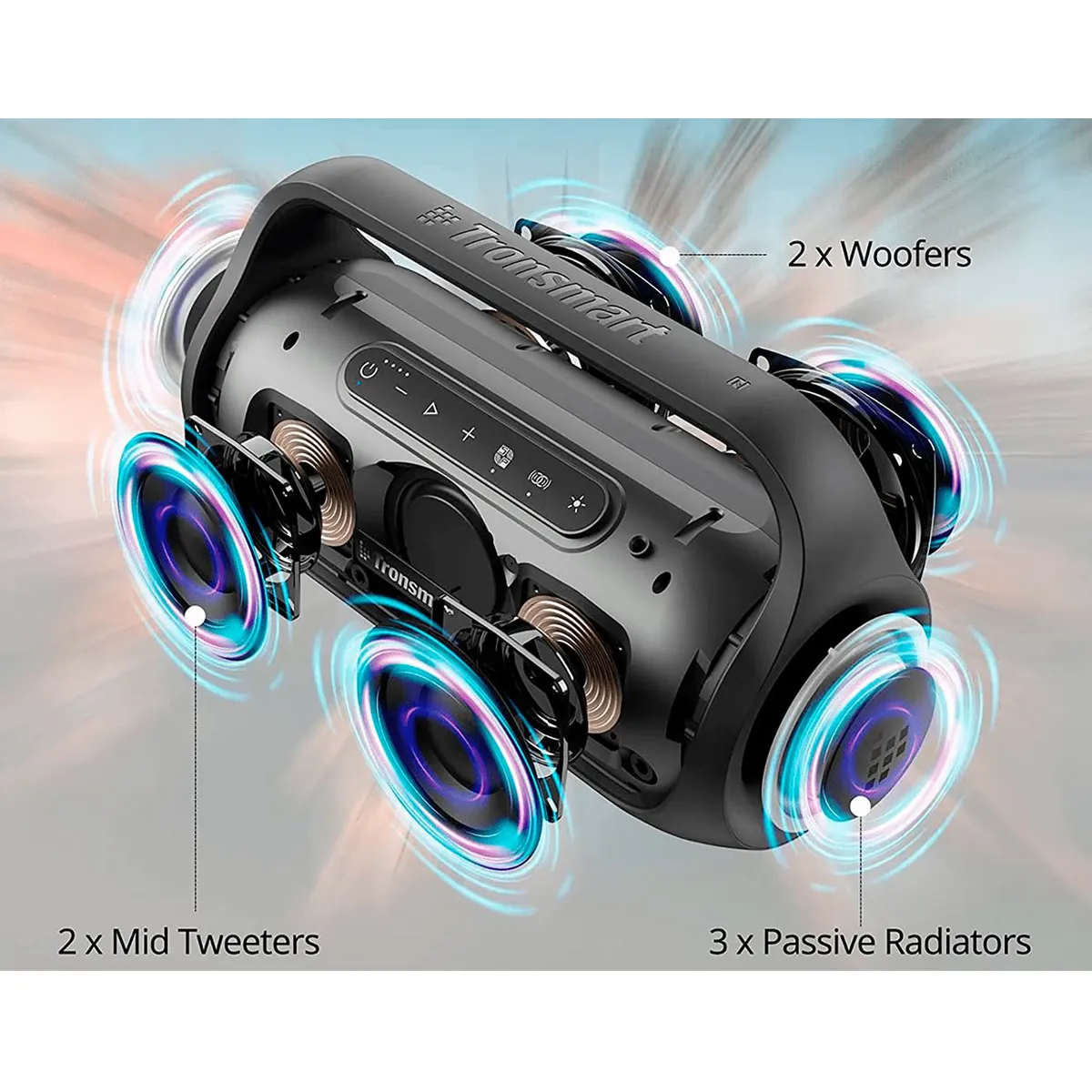 Dale más fuerza a tu música en cualquier lugar con el parlante Bluetooth Tronsmart Bang Mini, un altavoz portátil pensado para quienes buscan potencia, portabilidad y un sonido realmente envolvente. Gracias a su diseño de altavoz profesional con 2 cavidades independientes, logra un audio más equilibrado y definido: la cavidad frontal incorpora tweeters medios y radiador pasivo para agudos nítidos y claros, mientras que la cavidad trasera integra 2 woofers que entregan graves contundentes con gran impacto.