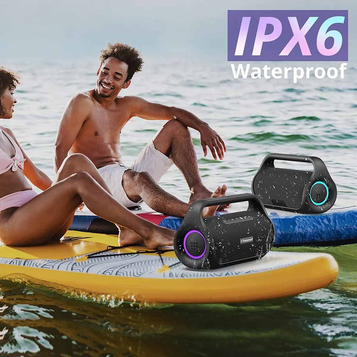 Diseñado para acompañarte en exteriores, cuenta con resistencia al agua IPX6, protegiendo contra lluvia, salpicaduras y derrames. Su acabado moderno de bordes redondeados se siente premium y su asa integrada facilita transportarlo. También es compatible con asistentes de voz como Siri, Cortana y Google Assistant, para un control más cómodo.