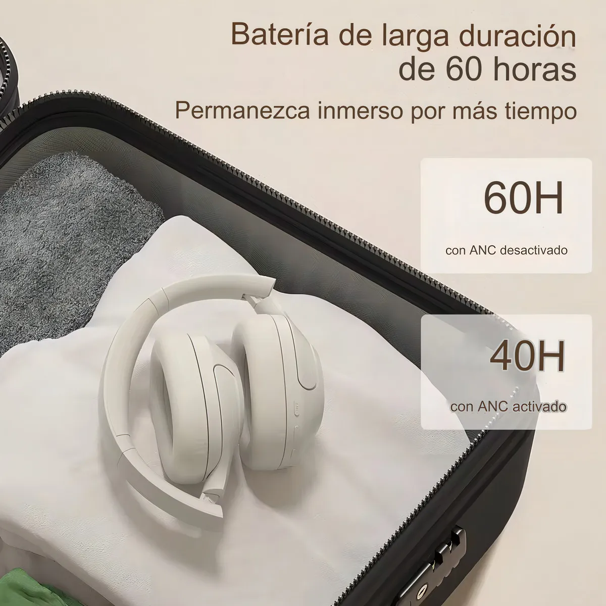 Otro punto fuerte es su autonomía: brindan hasta 60 horas de batería en reproducción inalámbrica y se cargan mediante USB Tipo-C. Su diseño plegable los hace fáciles de guardar y transportar, perfectos para llevarlos a la oficina, a clases o de viaje.