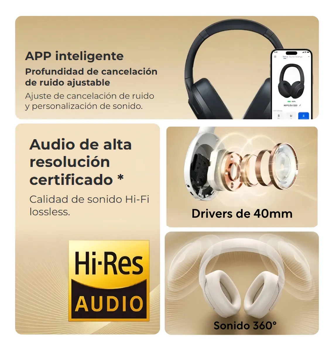 Los audífonos Haylou S30 ANC integran drivers dinámicos de 40 mm y cuentan con certificación Hi-Res, lo que se traduce en un sonido de alta fidelidad con agudos nítidos, medios definidos y bajos con mayor profundidad. Si quieres una sensación más envolvente, puedes activar el sonido espacial 360, logrando una escena sonora más amplia e impactante.
