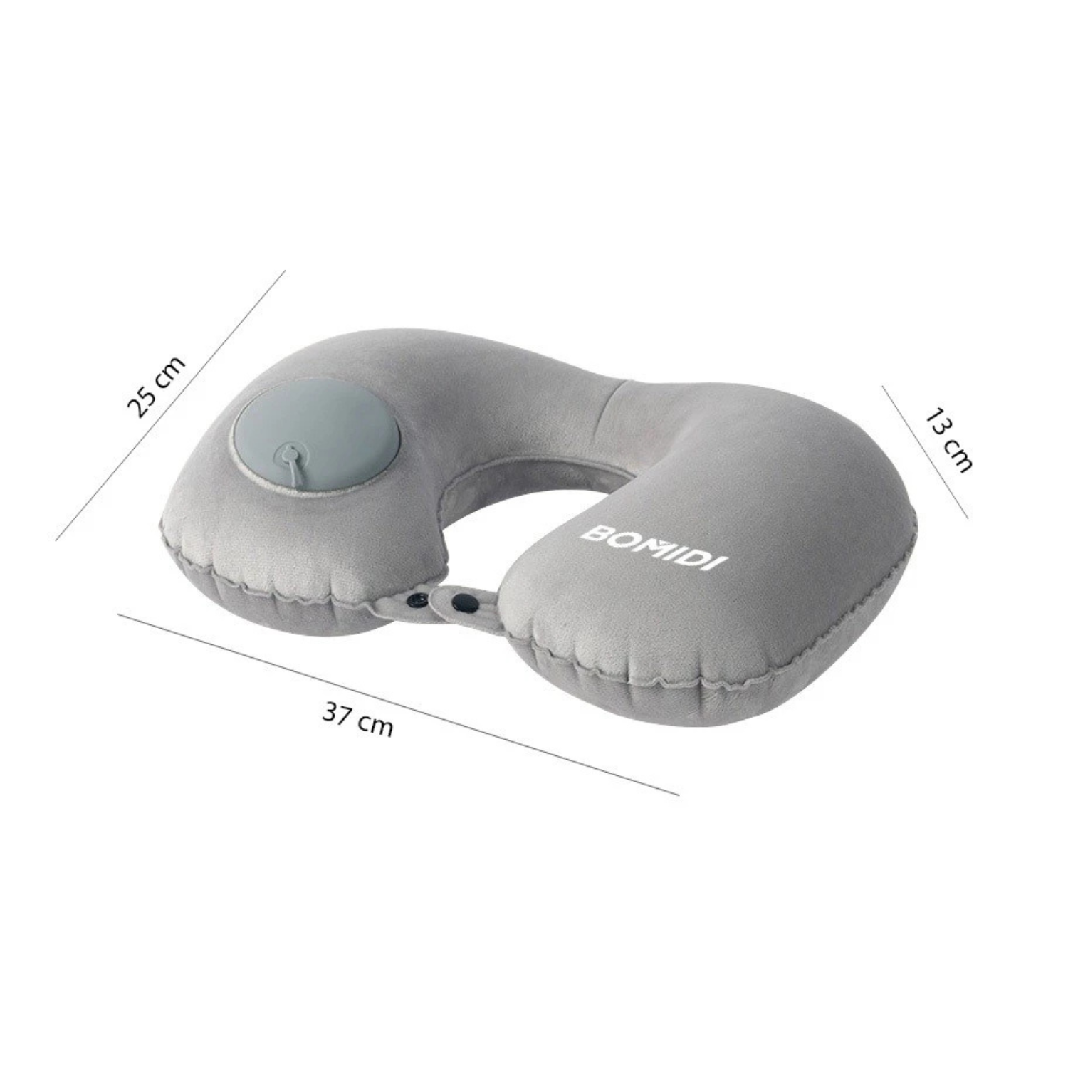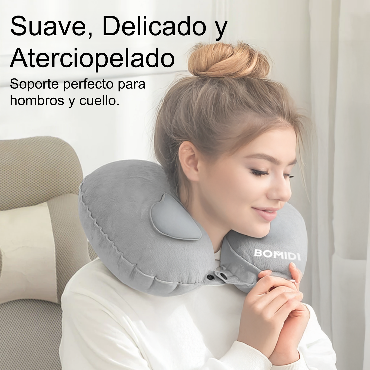 Almohada de Viaje Inflable BOMIDI U02: descanso cómodo y soporte cervical en cualquier trayecto. Se infla en aprox. 1 minuto con su sistema de presión manual, y su diseño en U se adapta al cuello para ayudar a aliviar la tensión y mantener una postura más estable en avión, tren o auto.