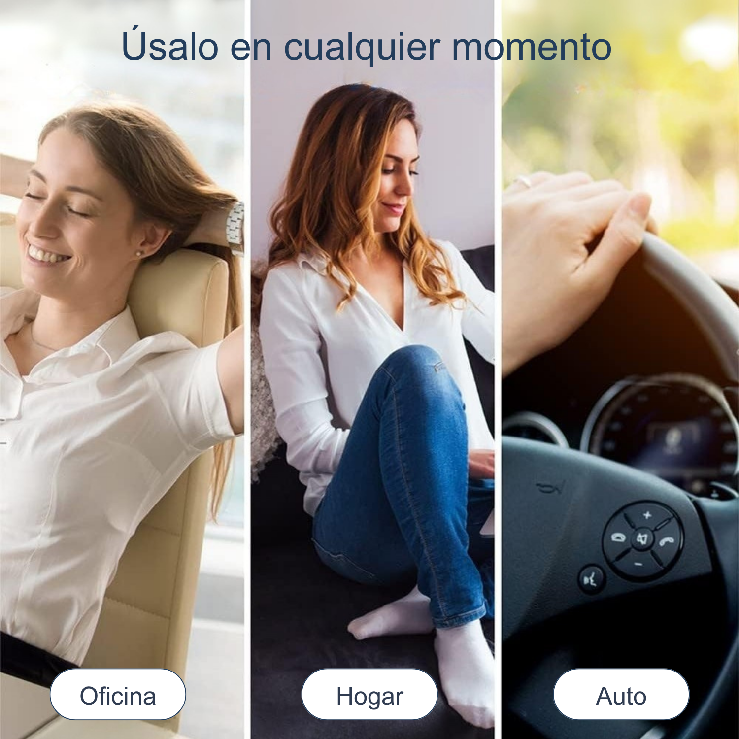 Para mayor practicidad, incluye adaptador de corriente 110–240V y cargador para auto 12V, permitiéndote usarlo en sofá, silla de oficina, cama o asiento del vehículo, con una experiencia cómoda y simple.