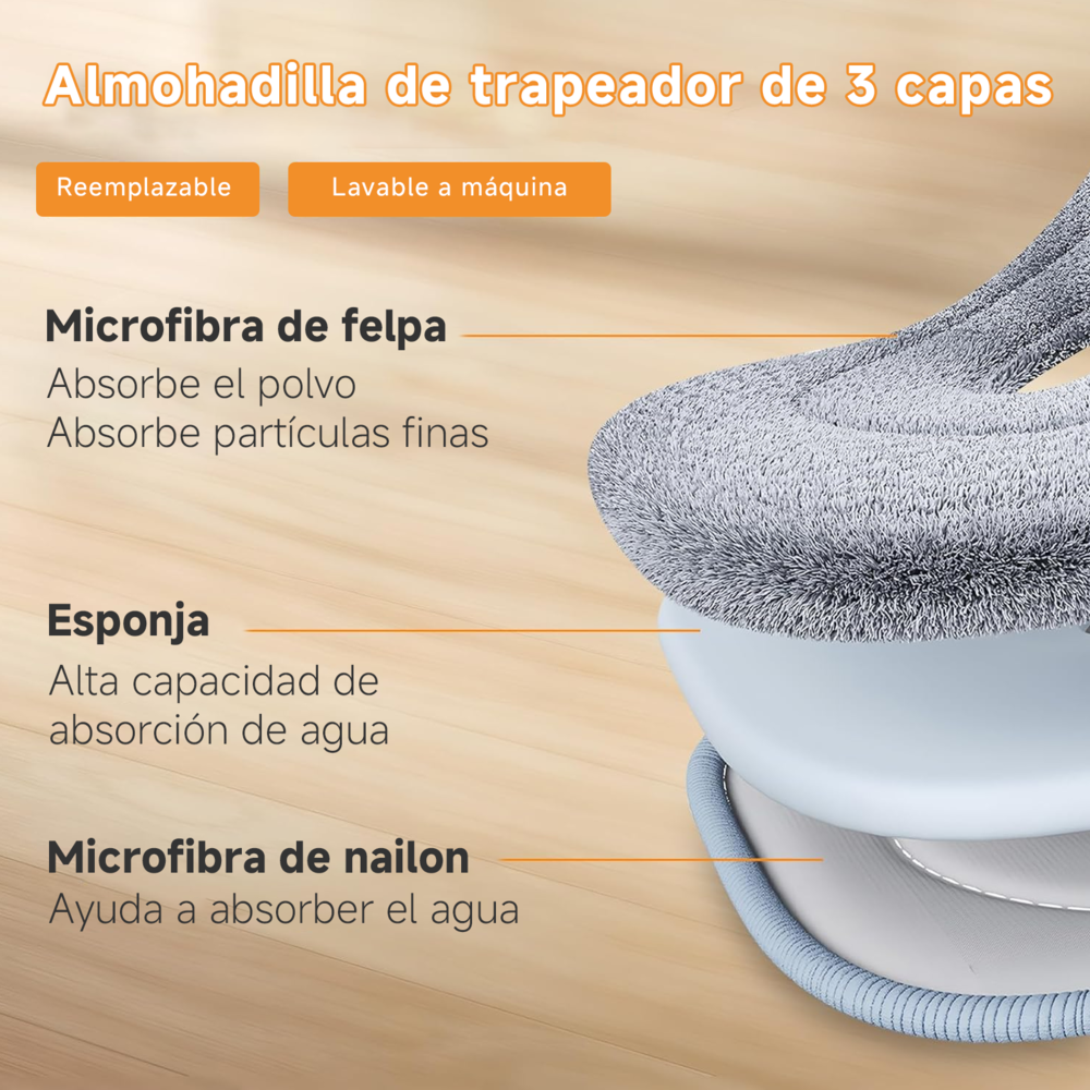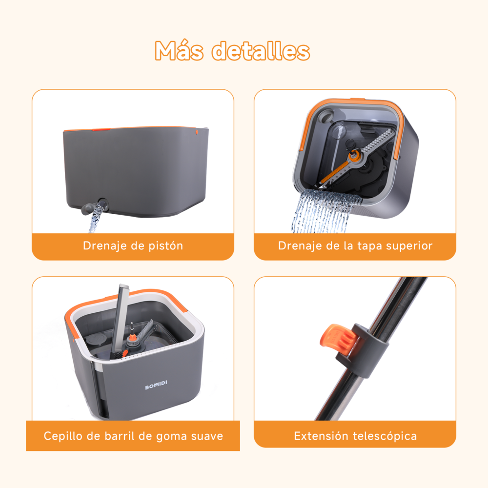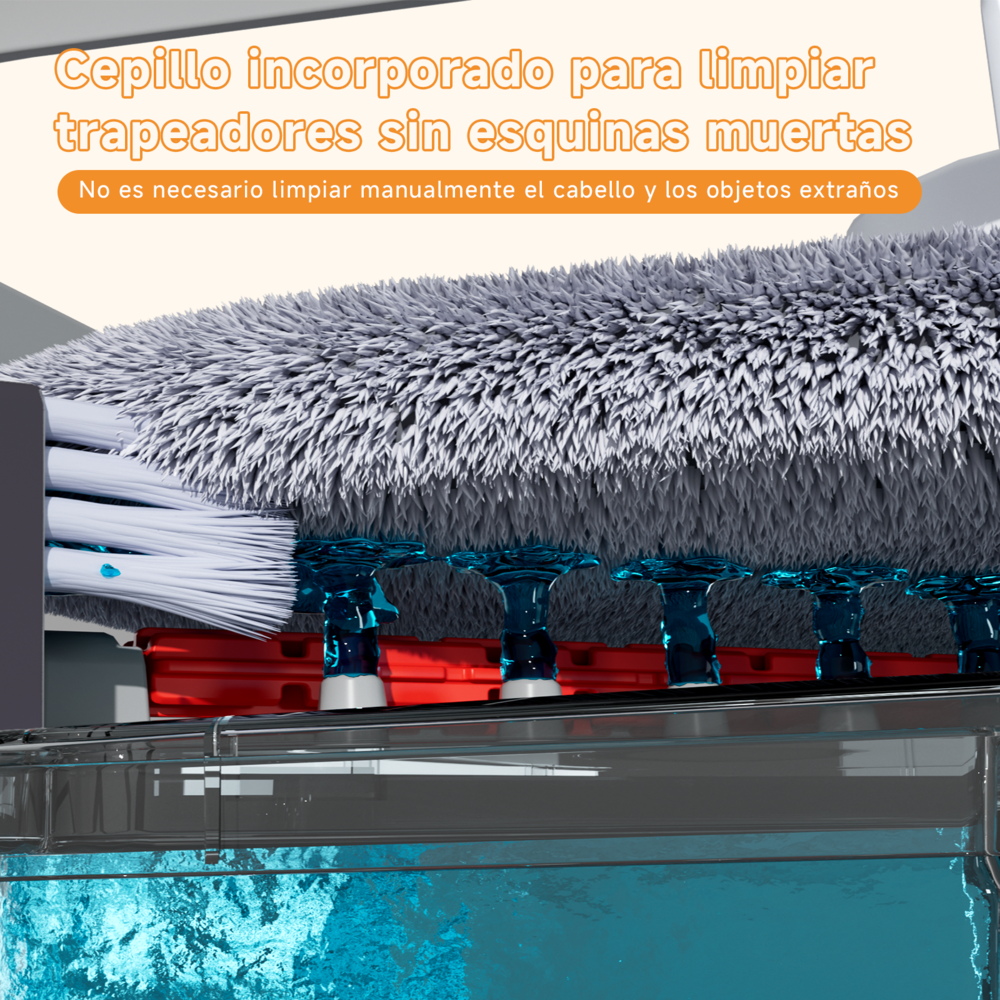 El cabezal de microfibra llega fácil a esquinas y debajo de muebles, y el sistema ayuda a retirar pelos y suciedad automáticamente, perfecto para hogares con mascotas o zonas de alto tránsito. Incluye mango telescópico ajustable (94 a 155 cm), cubeta desmontable con drenaje rápido, 2 cabezales de microfibra y cepillo de limpieza para un mantenimiento práctico y duradero.