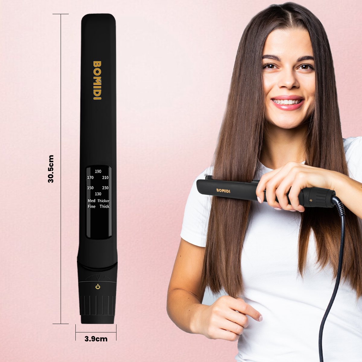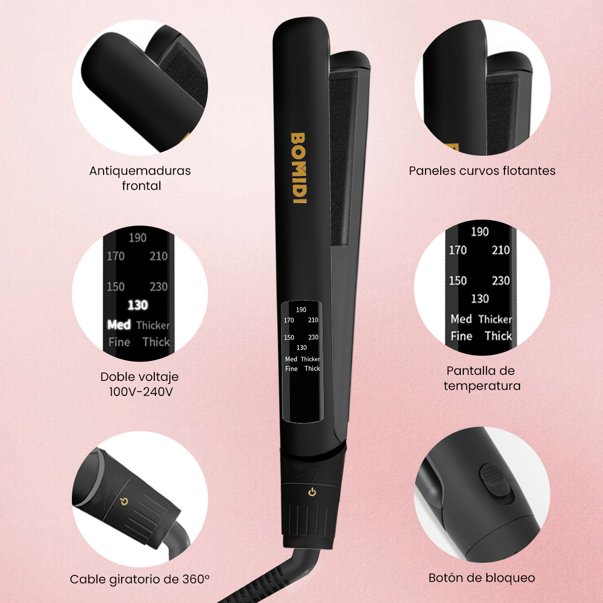 La Plancha de Cabello BOMIDI HS2 te ayuda a lograr un alisado uniforme con acabado de salón, cuidando tu cabello en cada pasada. Incorpora 6 niveles de temperatura (130°C a 230°C) para adaptarse a cabello fino, normal o grueso, y calienta en solo 15 segundos con tecnología MCH. Sus placas flotantes curvas ofrecen un deslizamiento suave sin tirones, mientras el recubrimiento cerámico con aceite esencial aporta brillo y suavidad. Además, la Plancha de Cabello BOMIDI HS2 incluye control intuitivo y cable giratorio 360° para máxima comodidad.