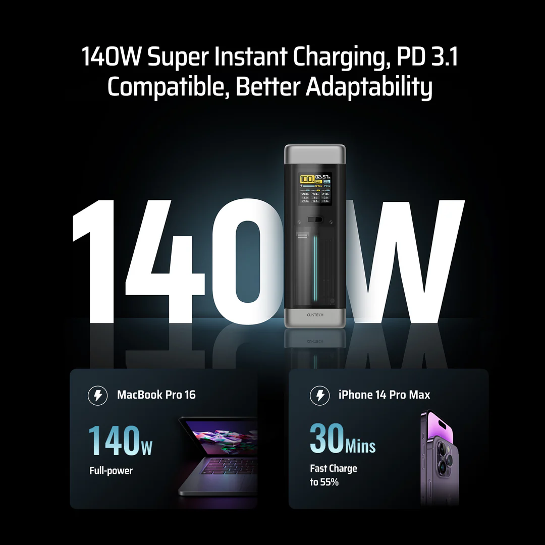 La power bank CUKTECH 20 está pensada para usuarios exigentes. Ofrece carga rápida de alto rendimiento para laptops y smartphones. Es compatible con PD 3.1 y entrega hasta 140W en el puerto principal. Esto mejora la velocidad en equipos compatibles, como laptops de alto consumo.