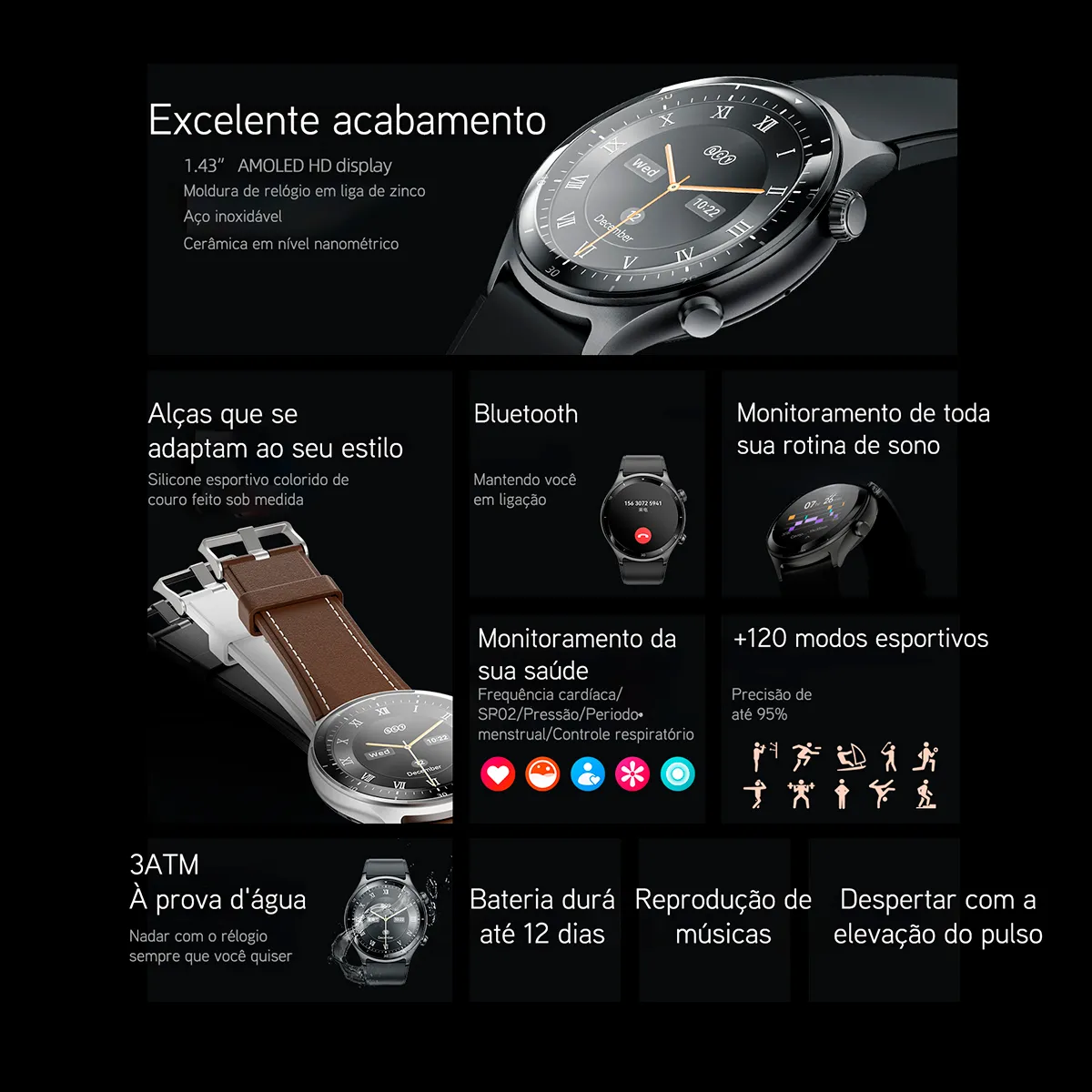 Su pantalla AMOLED de 1.43” con resolución 466×466 ofrece una visualización nítida y fluida, perfecta para revisar métricas, notificaciones y controles con claridad. Además, su formato ligero (aprox. 55.5 g) y correa de 22 mm lo hacen cómodo para llevarlo todo el día.