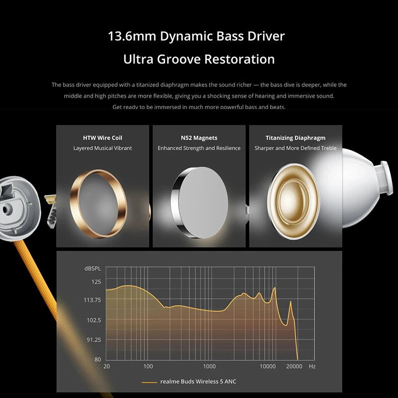 En sonido, los Realme Auriculares inalámbricos 5 ANC montan un driver dinámico de 13.6 mm con diafragma de titanio e imanes N52, pensado para ofrecer graves más profundos y una reproducción clara en medios y agudos. Además, suman audio espacial 360°, un efecto envolvente que aporta sensación tridimensional para música, películas y juegos, haciendo que el sonido se perciba con más profundidad y dirección.