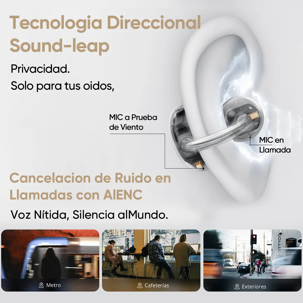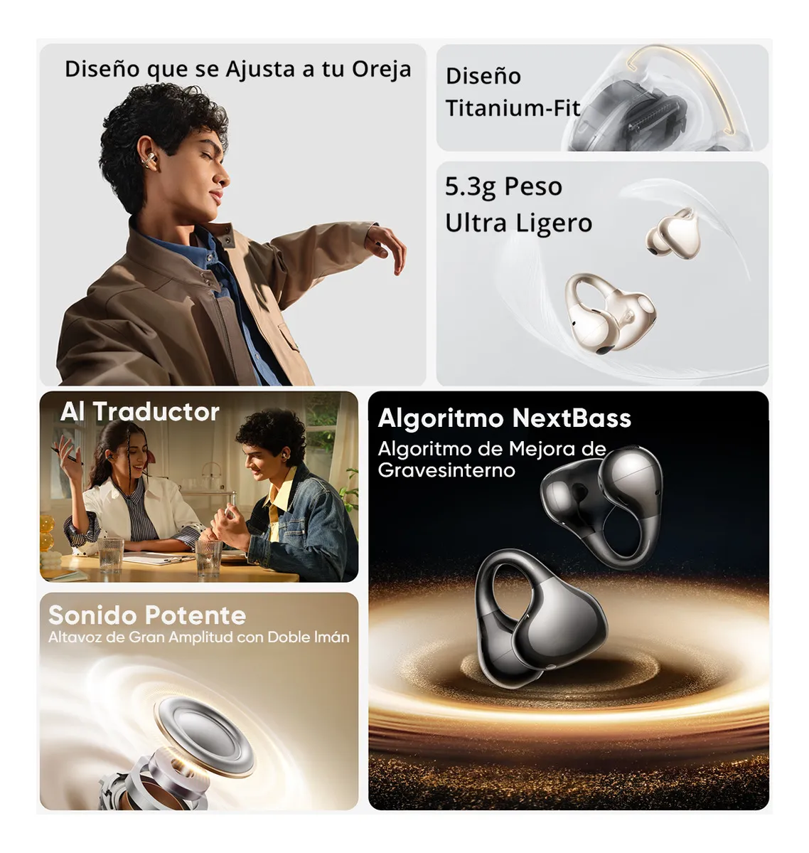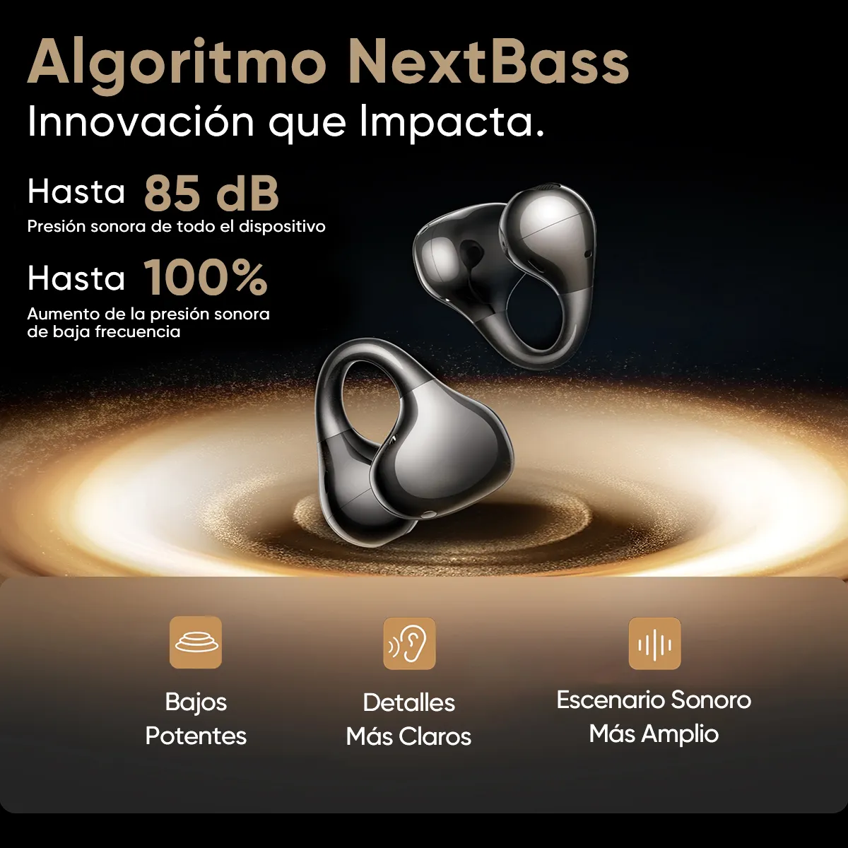 En sonido, incorporan un driver de 11 mm con doble imán (dual-magnet) y gran amplitud, pensado para entregar un audio más lleno y con buena presencia. Además, integran tecnologías como Sound-leap directional tech para una transmisión más precisa y el NextBass Algorithm, que mejora el rendimiento de graves para una experiencia más envolvente, incluso en un formato de oído abierto.