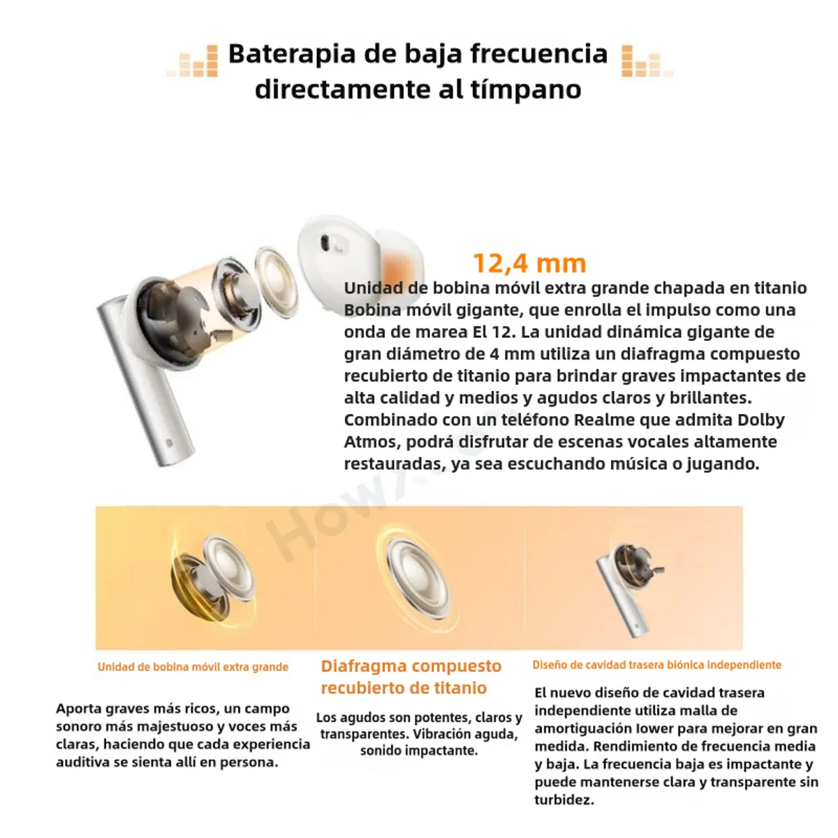 Su corazón es una unidad súper titanizada de 12.4 mm, que aumenta el área de vibración frente a drivers estándar, logrando un campo sonoro más amplio, graves más profundos y una voz humana más definida. Además, incorporan mejora dinámica de bajos, un algoritmo que ajusta el bass en tiempo real para que el golpe llegue justo cuando debe, entregando una sensación más inmersiva sin saturar el sonido.