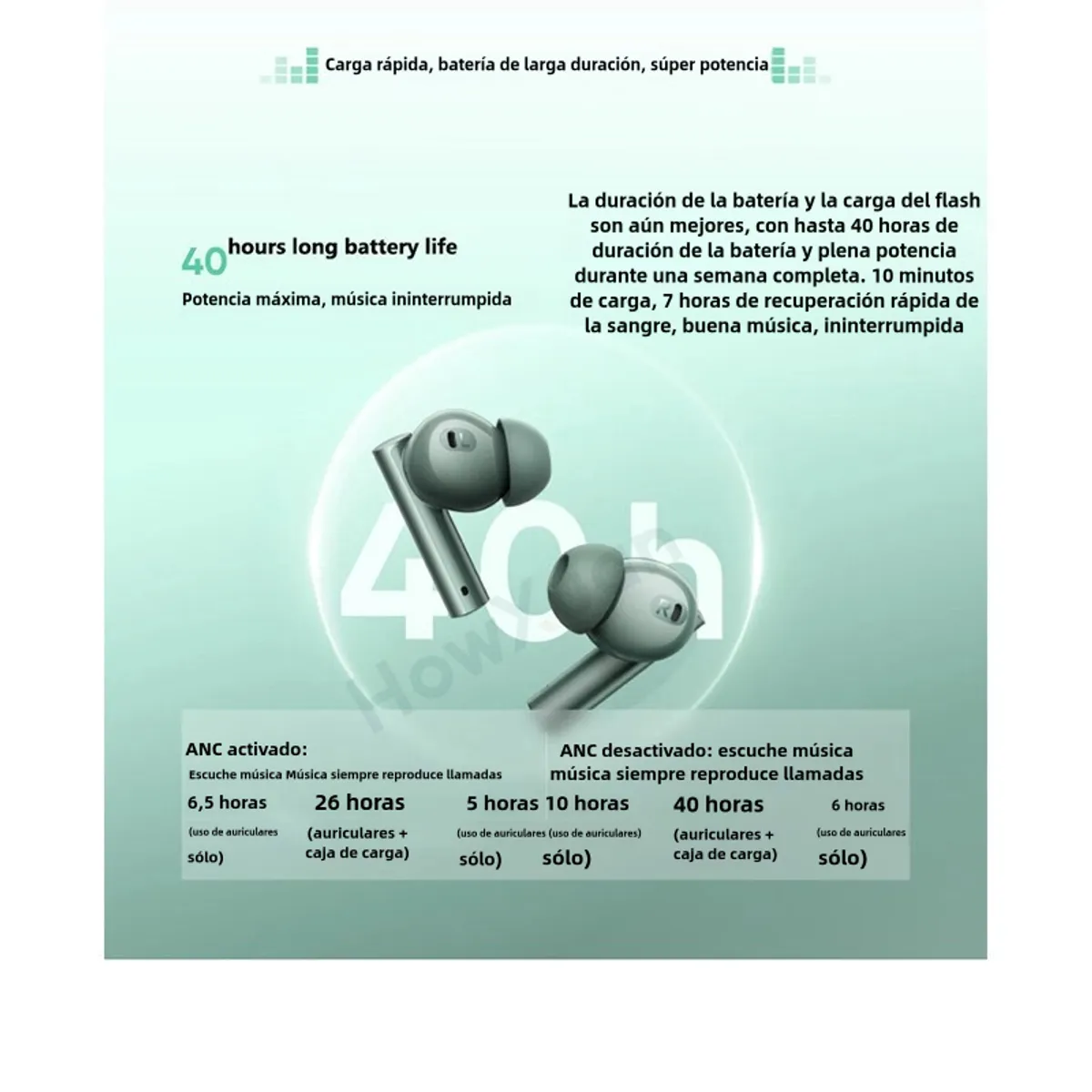 En autonomía, están listos para el día a día y para viajes: ofrecen hasta 40 horas de batería con el estuche (según condiciones de uso) y cuentan con carga rápida, logrando hasta 7 horas de escucha con 10 minutos de carga. La carga es por USB Tipo C y los auriculares incluyen resistencia IPX5 (solo audífonos) para sudor y salpicaduras, perfectos para rutinas activas.